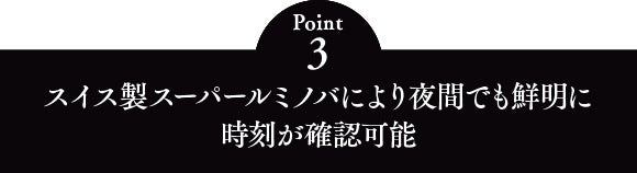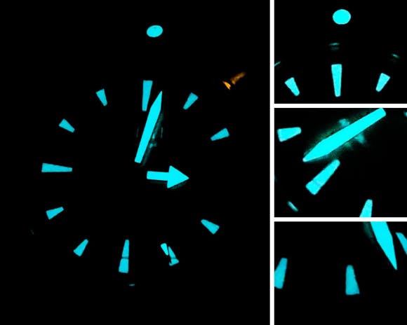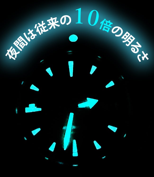 スーパールミノバは自発光塗料であるトリチウムと比較した場合、残光時間と輝度が10倍以上高く、照度500ルクス(20Wの蛍光灯下50cmほどの明るさ)の光を10分間吸収しただけで、315時間発光する能力を持ちます。