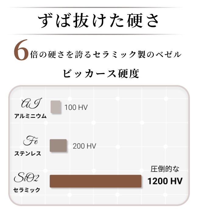 セラミックの長所というのはなんと言ってもその硬度の高さ。硬さを示すビッカース硬度(※1)でいうと1000~1200HVほどの硬度があり、アルミニウムやステンレスの6倍の硬さを持ちます。