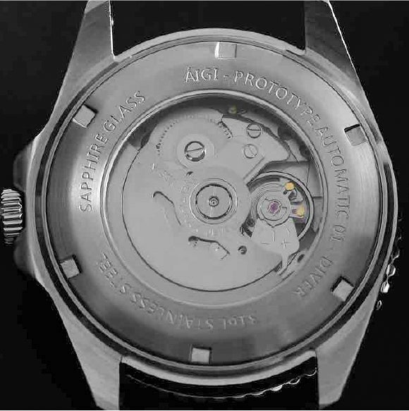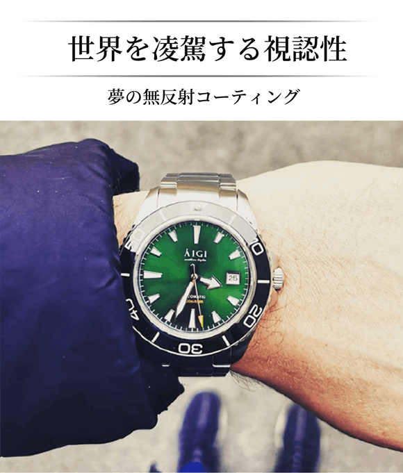 またアイギオートマチック(AIGI Automatic)はサファイアグラスを採用している上位ランクの時計のごく一部の時計に施されている「光の反射を抑える無反射コーティング」をサファイアグラスの裏面に施しています。