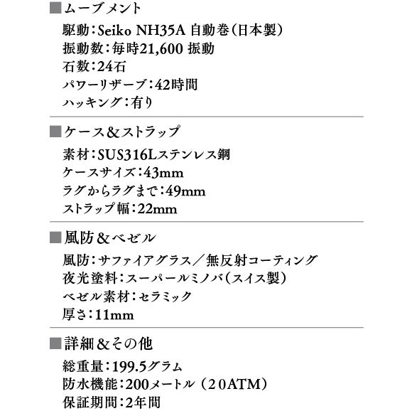 日本が誇る時計メーカー、セイコーのNH35Aを時計の心臓部となるムーブメントに使用。