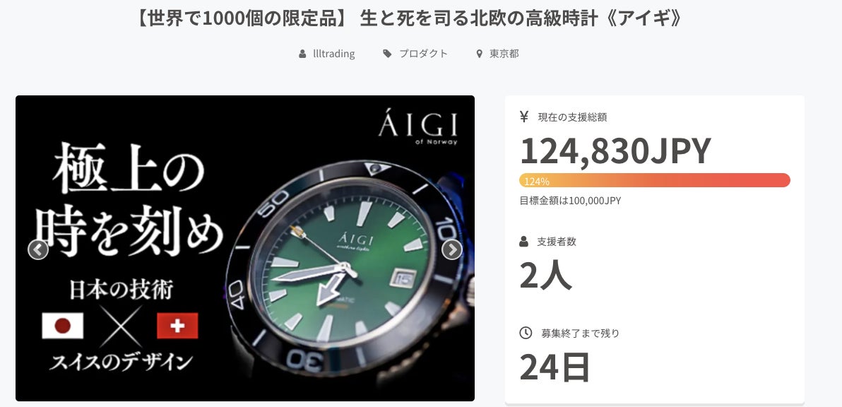 2021/11/04 19:06サポーターの皆様この度は「生と死を司る北欧の高級時計《アイギ》」をご支援いただき大変ありがとうございます。皆様の熱いご支援により無事目標金額を達成し、プロジェクトを成功へと導くことができました。今回プロジェクトを達成できたのは皆様のご支援があってのことです。誠にありがとうございます。 ぜひこの機会に時計好きのご友人やご家族の方々にプロジェクトの達成をシェアすると共にこの「希少で素晴らしい高級時計を購入したという体験」をご共有されてはいかがでしょうか?今後ともプロジェクトに関してメンバー一同誠意を持ってご対応させていただきますので何卒宜しくお願い致します。 もっと見る