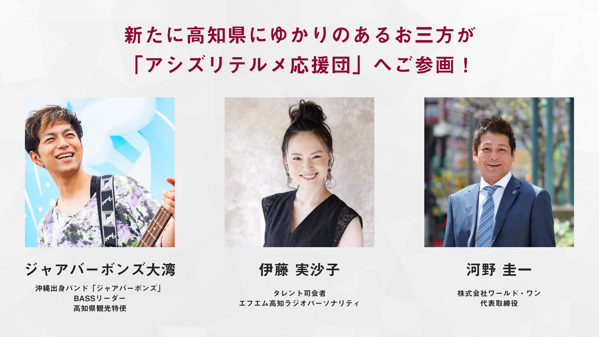 さて、本日は「アシズリテルメ応援団」に新たにご参画くださった3名様を頂戴した応援メッセージと共にご紹介させてください。(以下、ご参画の決まった順となります)