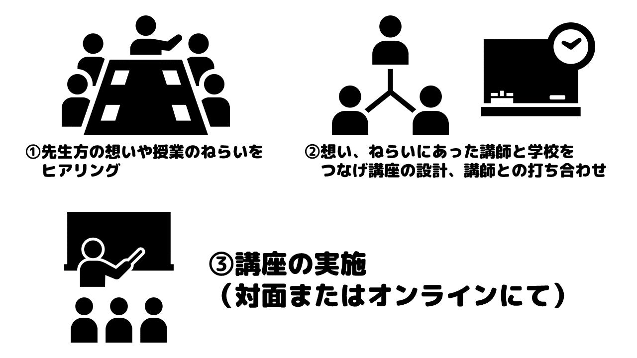 代替プログラムを実施するにあたり、まずは、先生方の想いやニーズ、授業のねらいなどヒアリングさせていただきます。ねらいに合った学校外の人材を学校と繋げ、講座の設計から講師打合せ、当日運営等、全体をサポートをしていきます。感染対策による制限等によって、学校外に行くことは難しいという場合でも、学校内で実施できる講座(オンラインまたは対面実施)を考案して実施します。