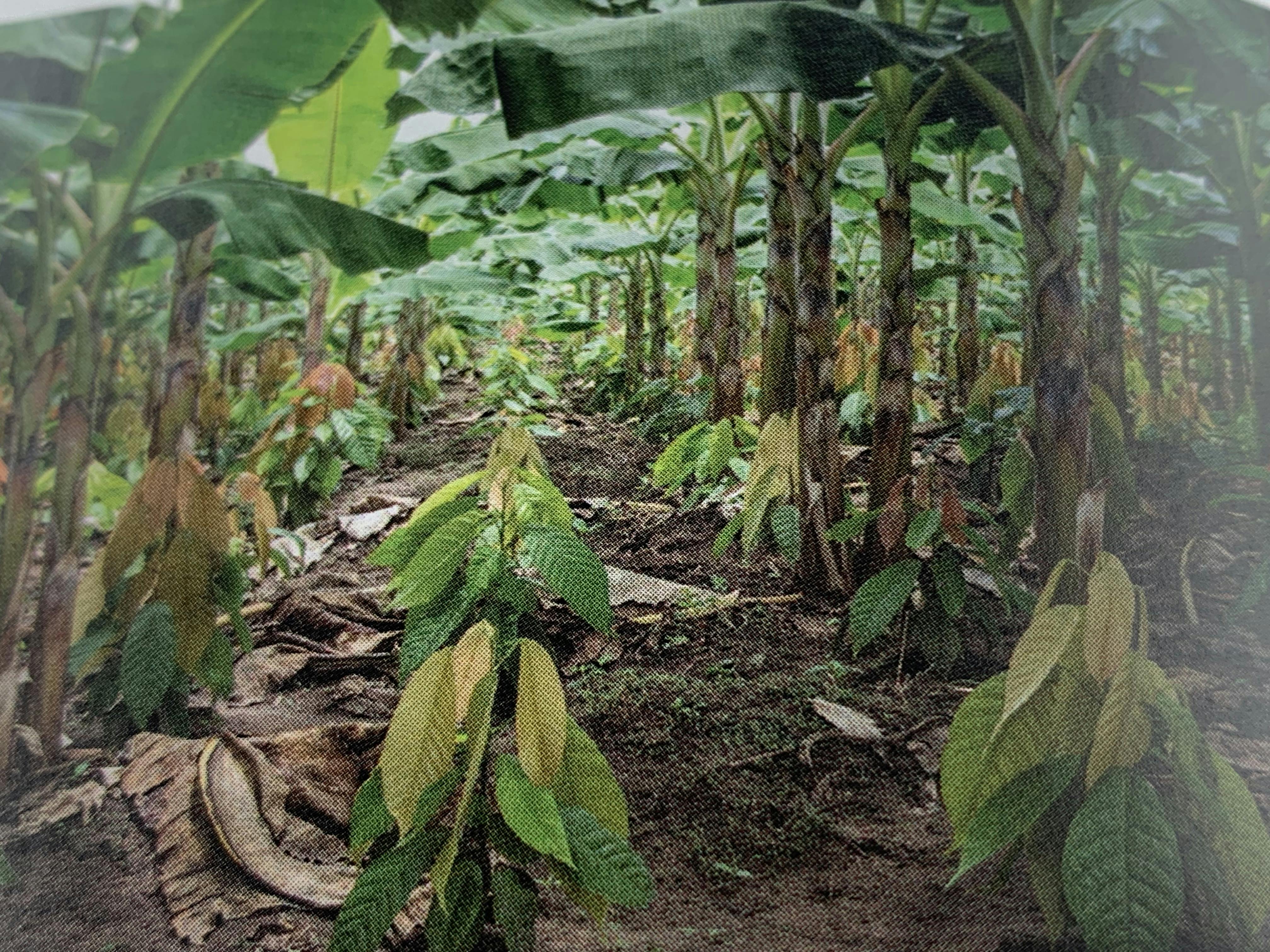 添付してある画像の小さい木はカカオの赤ちゃんで、周りに生い茂ってるいのがバナナの木です。