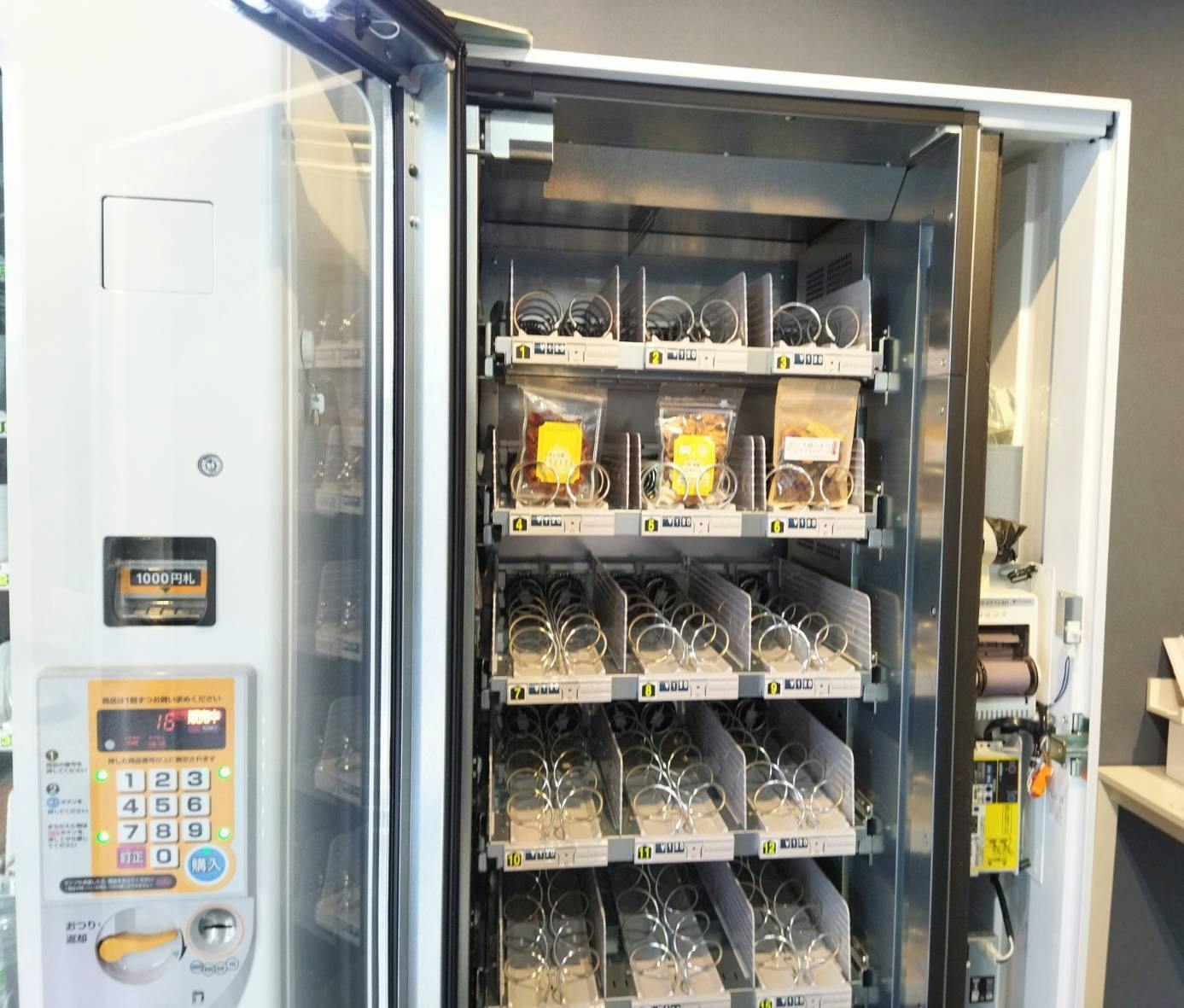 こだわりのドライフルーツの販売ですので、通常のジュースの自動販売機ではなく、ドライフルーツが傷つかないよう、商品がゆっくりと降りてくる機能のついた自動販売機で販売したい!と考えました。