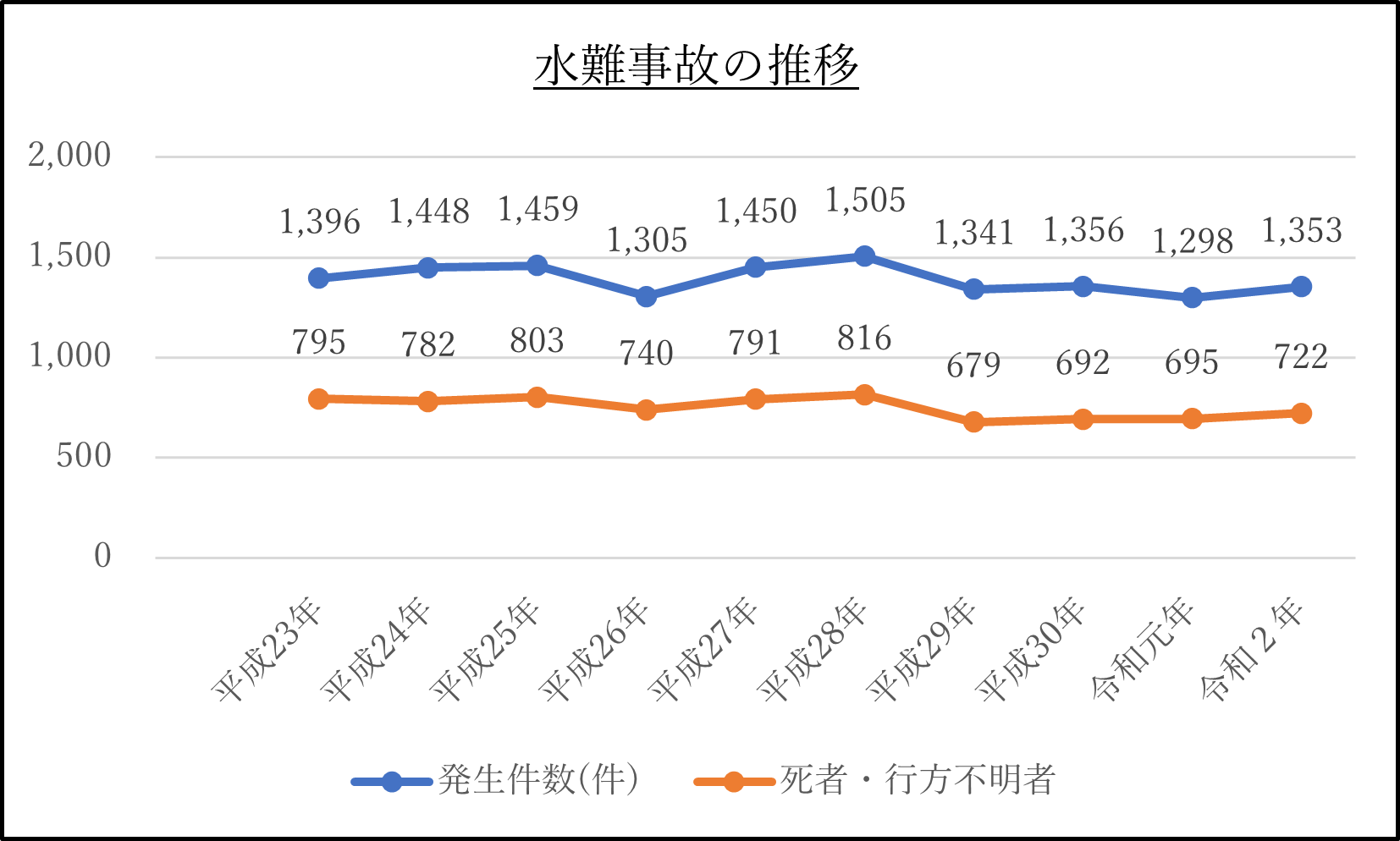 また、水難事故による死者・行方不明者の数は、平成23年からはほぼ横ばいの状態となっており、このコロナ禍においても、その数は変わらず多くの命が毎年、水難事故により失われております。