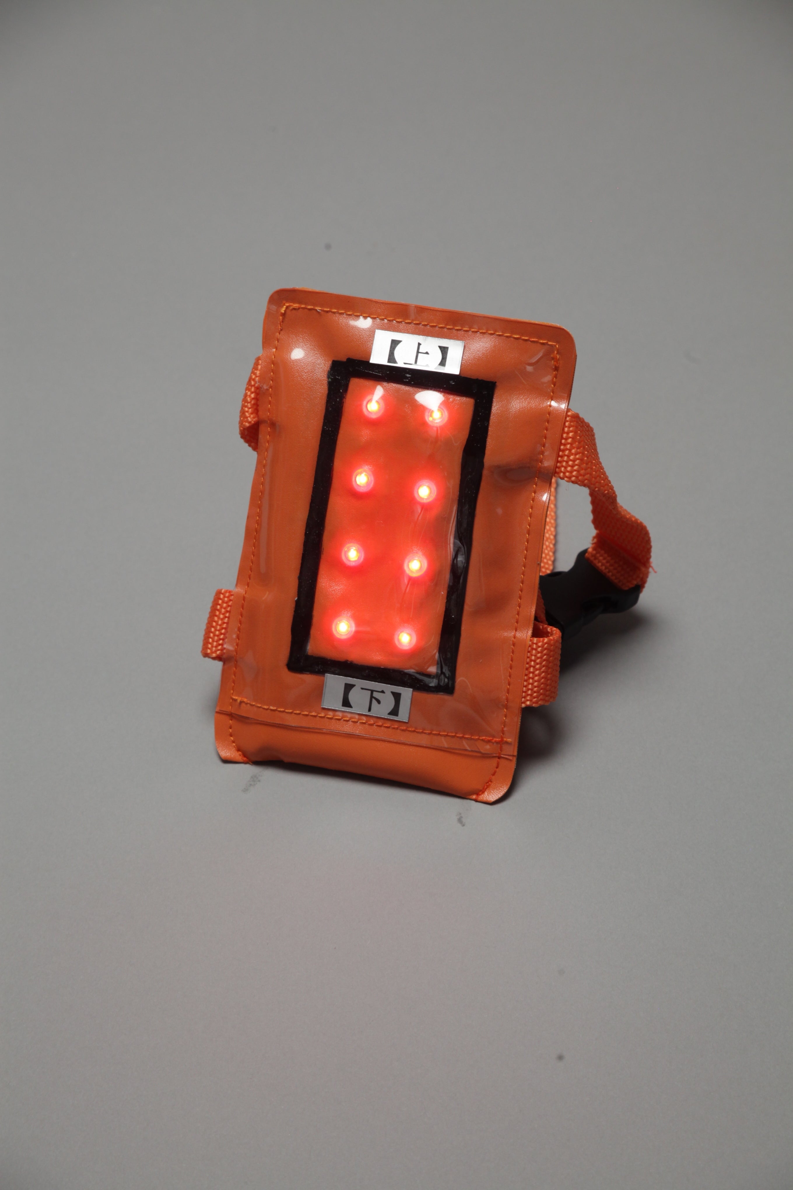今回、三嶋電子株式会社から技術提供をいただく「ライフライト」は、ライフジャケットに装着して水に触れると発電する水電池の力で、落水を感知し発光をして、救助者の目に留まりやすくします。