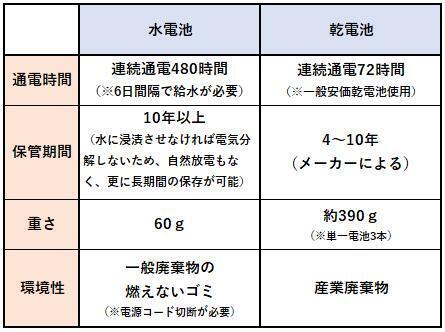 まずは水電池と乾電池の比較をご覧いただければと思います。