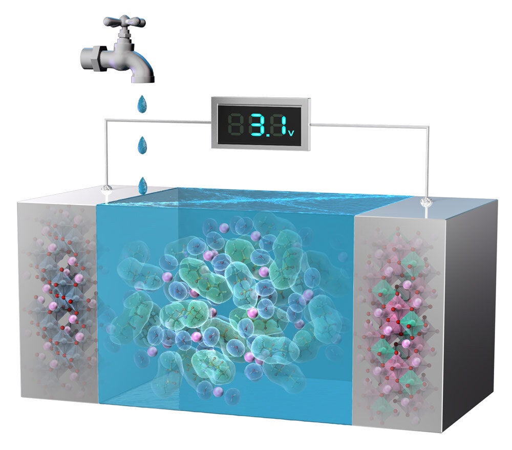 この水電池とは、三嶋電子株式会社が開発した柏葉水電池で、水に浸潰することにより発電をする電池のことです。