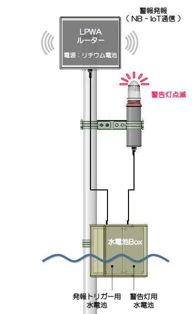 最近では、この水電池を使用した河川増水危険警告灯を開発し、国土交通省に採用され試験運用されております。