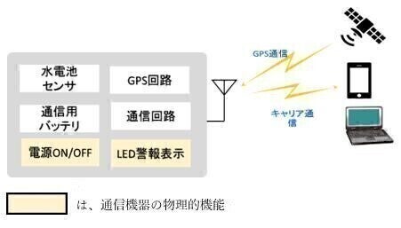 前述したとおり、従来のライフライトでは水電池が水に触れることで光を発光させるのみの機能でしたが、【ライフライト2021】は発光するのみではなく、さらに水電池をセンサーとして使用し、水電池センサーを経由して発電した信号により位置情報を無線通信で発信させる機能を搭載します。
