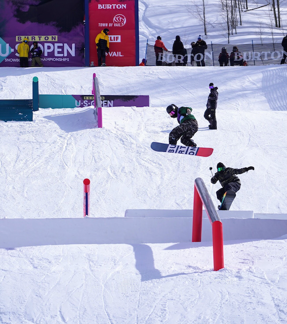 キッカー(雪のジャンプ台)や、ジブアイテム(レールやボックスなどの雪以外でできたアイテム)などが設置されたコースを滑り、全ての滑りが総合的に採点され、その得点で競われる種目です。