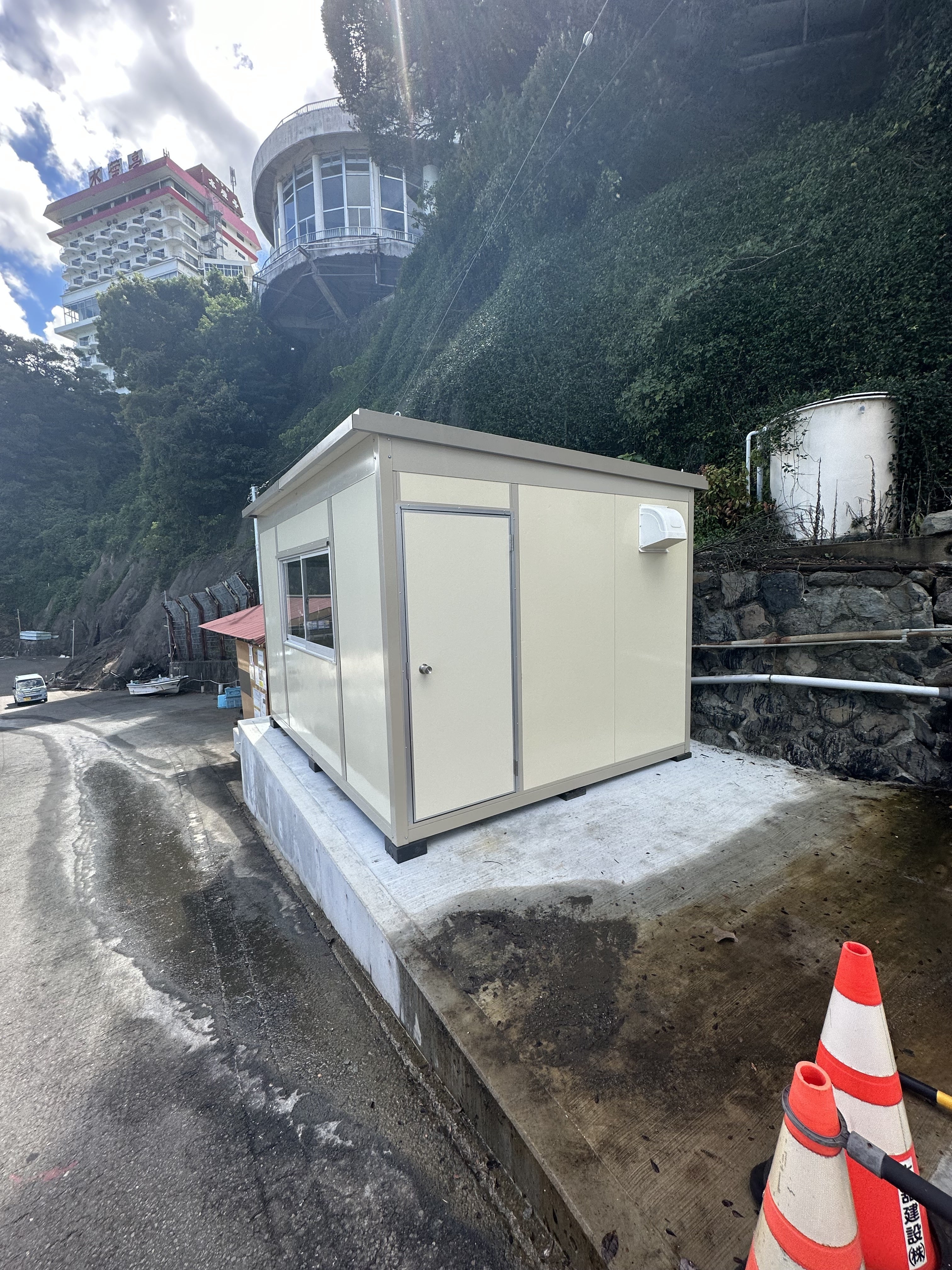 ようやく倉庫兼用仮詰所が設置できました。