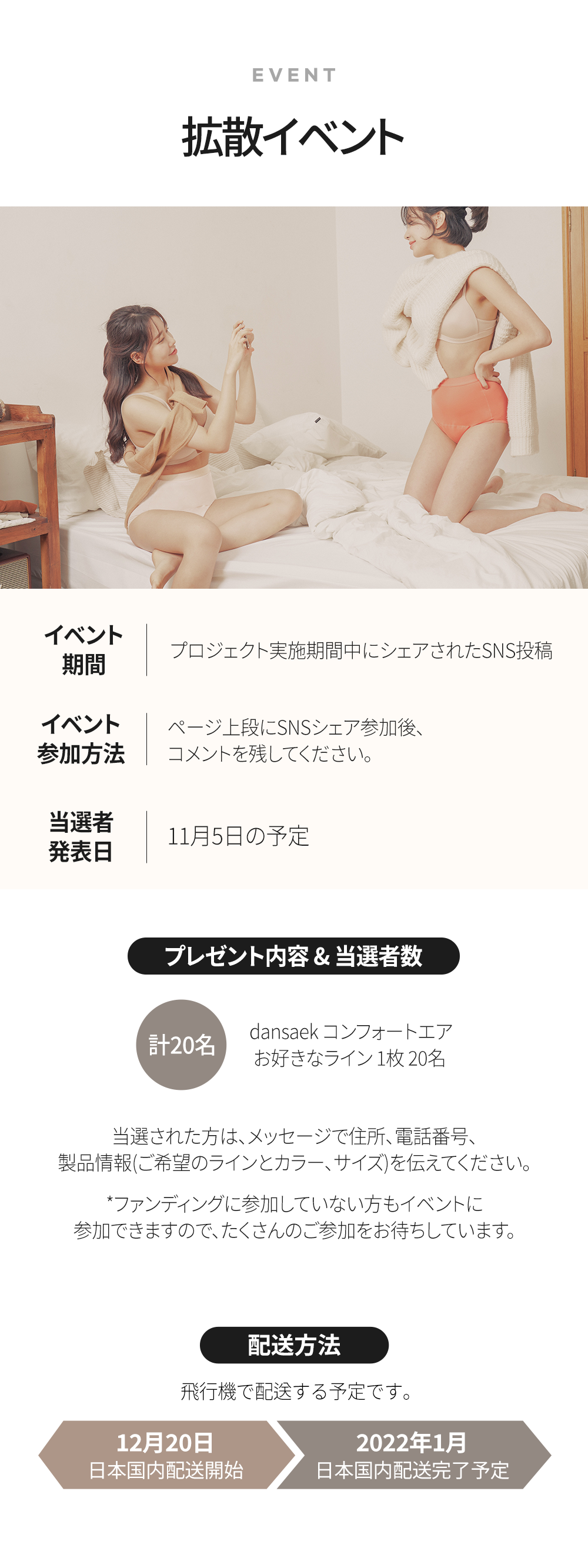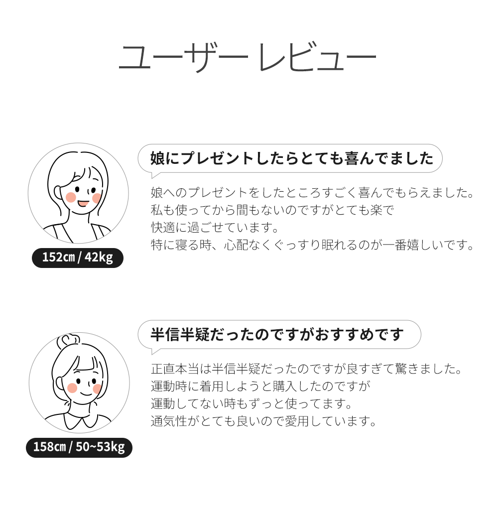 2021/10/26 15:27支援者の皆さん、こんにちは。たくさんの応援をいつもありがとうございます!支援者の皆さまのおかげで、コンフォートエアファンディングが目標を達成させることができました。コンフォートエアは12月末~1月初旬中に韓国から日本に発送し、日本国内では1月中旬頃に支援者の皆さまにお届けする予定です。また詳細の配送日程が確定次第アップデートさせていただきます。通関など、入国時の問題で日程が延びるかもしれませんが、出来るだけ早く皆さまにお届けできるよう努力いたします。支援者の方々に再度感謝すると共に過去に購入してくださったお客様の暖かいレビューをご紹介します。大満足です!使い捨てのものと布タイプのものを両方使ったことがありますが、今回こちらの下着をを使ってみました。暑い夏にも快適に履けるよう、ドロー形のものを購入しました。しっかりとフィットしてくれるのに嫌な締め付けもなくとても快適に使用することができました。水分を吸収する面が広めに裁縫されており、最初の着用時は少し違和感を感じたのですが、自由な動きや水漏れを防ぐためには必要な部分なのだろうかと思います。慣れればいつも通りパンツを履いている感覚と同じなので非常に良い商品だと思います。一番感動したのが簡単に洗濯ができるということです。長時間使用してみましたが、心配とは裏腹に一切不快な思いをすることなく1日を過ごすことができました。全然ドロドロしていないので、トイレットペーパーで拭く必要もなく感激です!(洗濯する時冷水で必ず濯いでください)水で流すだけで簡単に汚れが落ちて感動しました!専用洗剤を少量溶いて5~10分漬けてから軽く手洗いしただけで綺麗になります。しみが残ったらシャンプーでこするだけで消えるので手入れがとても簡単です。また吸収する生地部分も厚くなく、よく吸収するにも関わらず薄いのでつけ心地も最高です。乾燥の心配もなく、作ってくださった単色スタッフの方々に感謝します。今までの生理中の悩みから解放され、とても満足度が高いです!以上です。それではまたアップデートいたします!よろしくお願いいたします。 もっと見る
