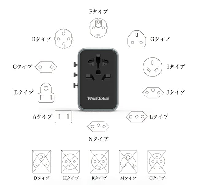 Worldplugは世界200以上の国・地域で使用可能。A、B、C、D、E、F、G、H、I、J、K、L、M、N及びOタイプのコンセントに対応しています。