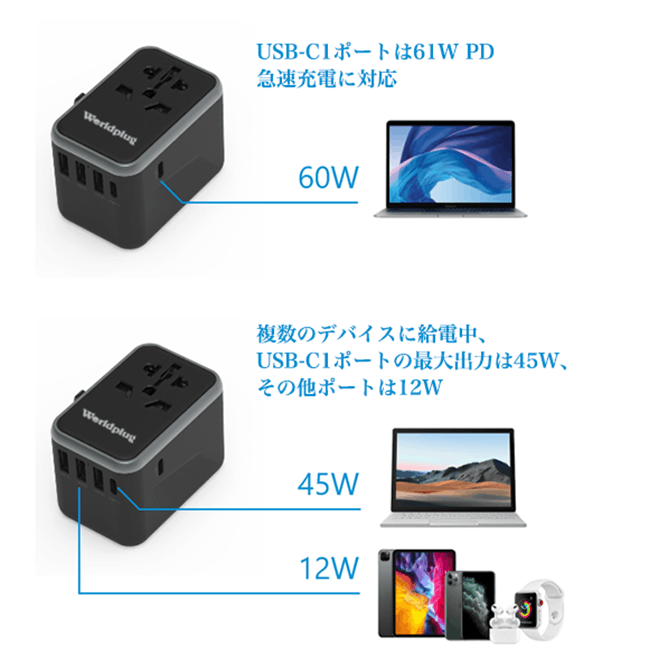 - Worldplugは60W PD対応の急速充電を採用しています。MacBook Proをアップルの純正アダプターなしで、2時間でフル充電可能。さらに、5つのUSB急速充電ポートを搭載しています。