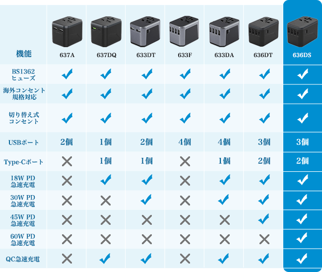 またACポートは世界のA、B、C、E、F、G、I、J、L及びNタイプのプラグを差し込む