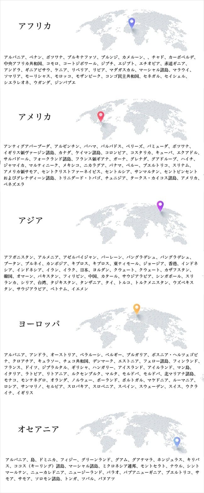 Worldplugが使用できる国・地域は以下の通りです(200以上の国・地域で使用できます)。