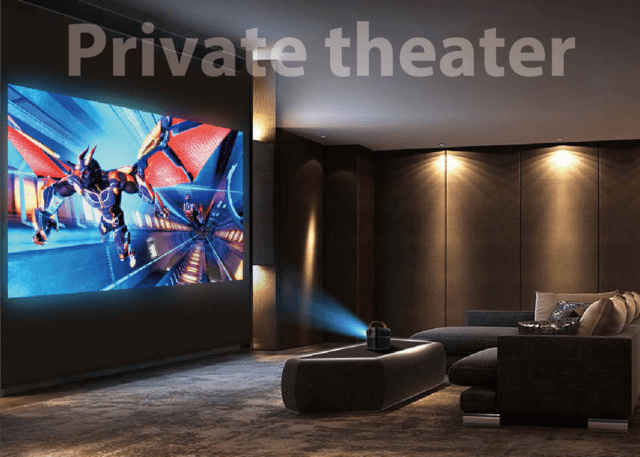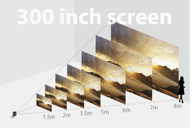 【ハンディ・シアター】はそのコンパクトさにも関わらず、最大300インチ(約6m x 4.5m)のビッグスクリーン投影が可能です。マンションの部屋の高さを超える大きなスクリーンから、個人で楽しむ小さなサイズの投影まで、自由に調整できます。