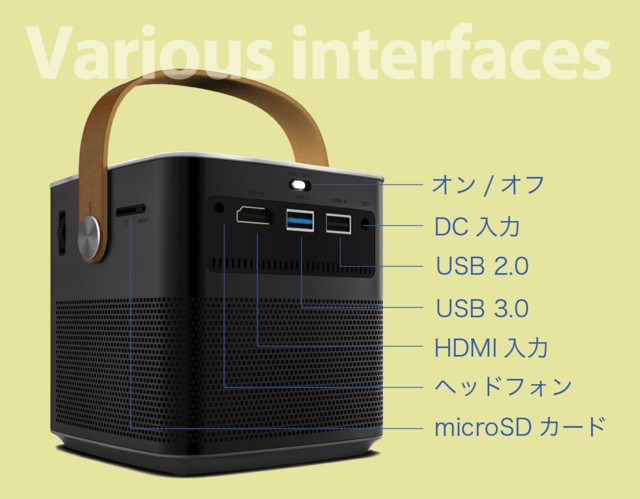 【ハンディ・シアター】はHDMI、Wi-Fi、USB、Bluetoothの各種インターフェイスを搭載。さまざまなデバイスを接続してプロジェクターを快適に利用することが出来ます。