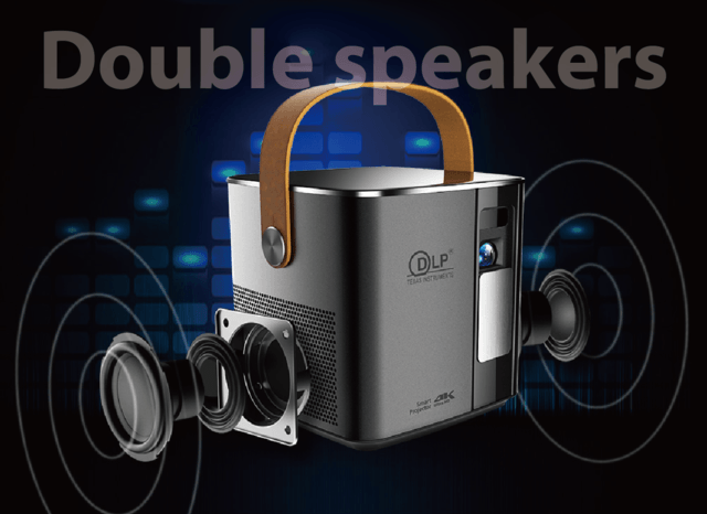 【ハンディ・シアター】にはスピーカーが内蔵されていますので、プロジェクター本体のみで映像とサウンドを両方お楽しみいただけます。従来のモバイルプロジェクターの多くは1Wの単一スピーカーですが、【ハンディ・シアター】は2Wのデュアル・スピーカーを搭載していますので、ステレオサウンドでの臨場感をお楽しみいただけます。
