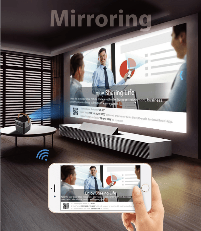 【ハンディ・シアター】に搭載されたミラーリング機能を使えば、スマホやパソコン、タブレットの画面をそのままスクリーンに投影できます。大きなスクリーンを見ながら写真の確認、ビデオの視聴、音楽の再生、ファイルの転送など、さながら大きなディスプレイを使っているような作業が、どこでも行えます。