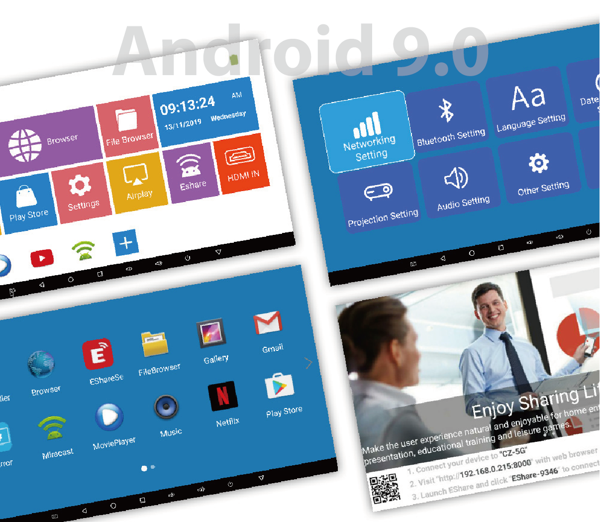【ハンディ・シアター】はお手元に届けばすぐに接続するだけで高機能プロジェクターとして使えます。Androidを搭載していますので、スマホと同じ操作性を実現。アプリのインストールも自由自在です。