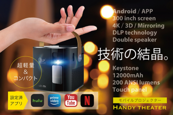 【ハンディ・シアター】はAndroidを内蔵した、ハイスペック・モバイルプロジェクター。バッテリー内蔵で、超軽量・コンパクトなので手軽に持ち運べ、リビングや寝室はもちろん、アウトドアでも大活躍。その場を一瞬にしてプライベートシアターに。大迫力の300インチの鮮やかなビッグスクリーンで美しい映像をお楽しみいただけます。