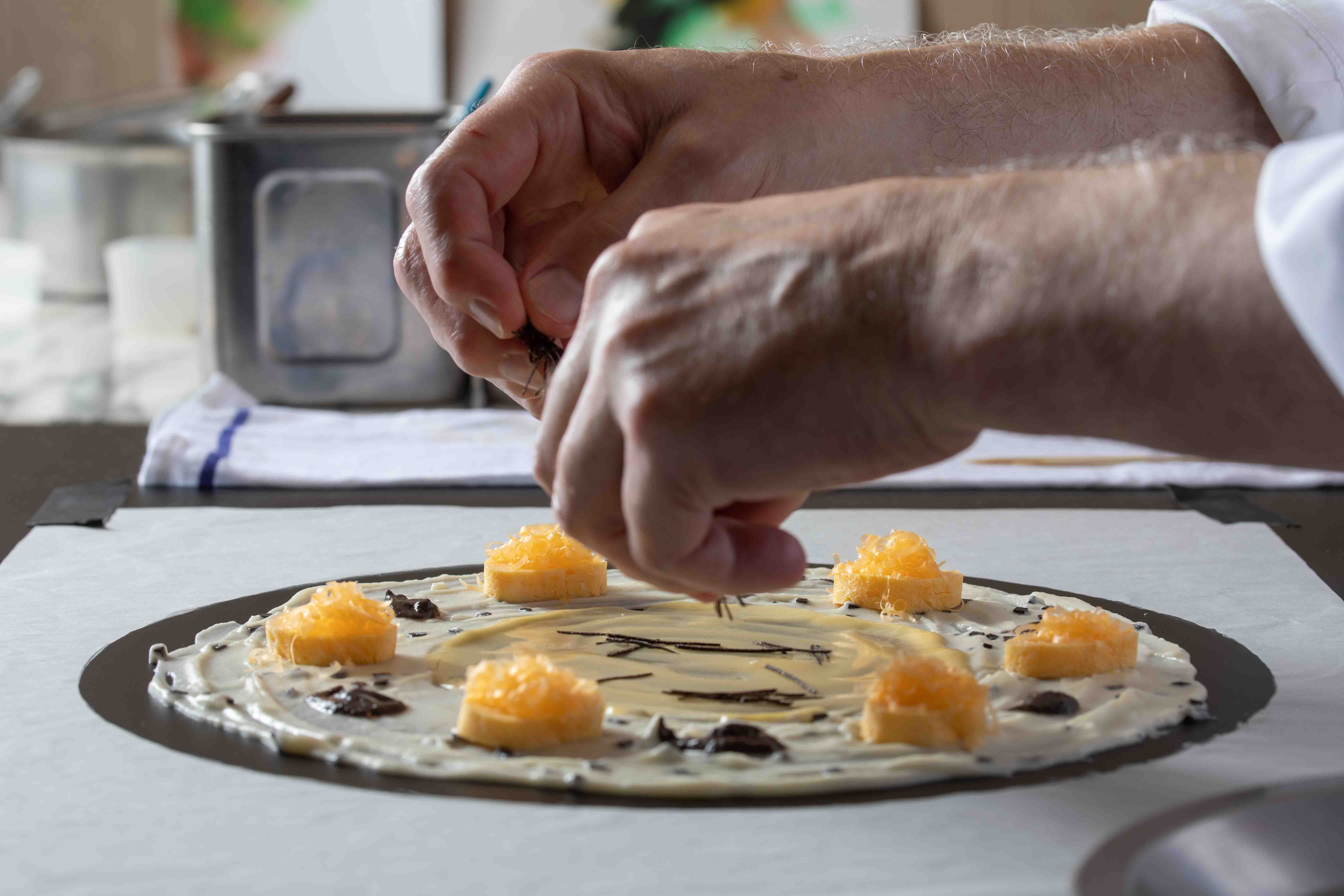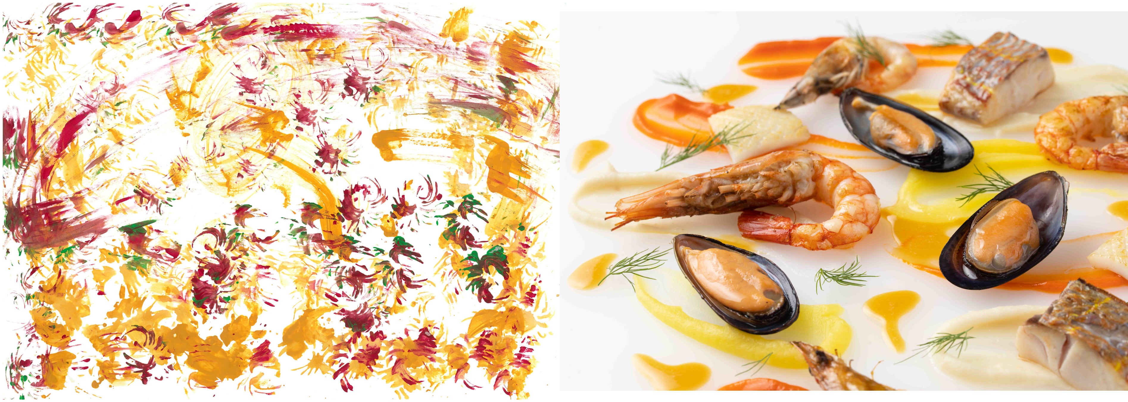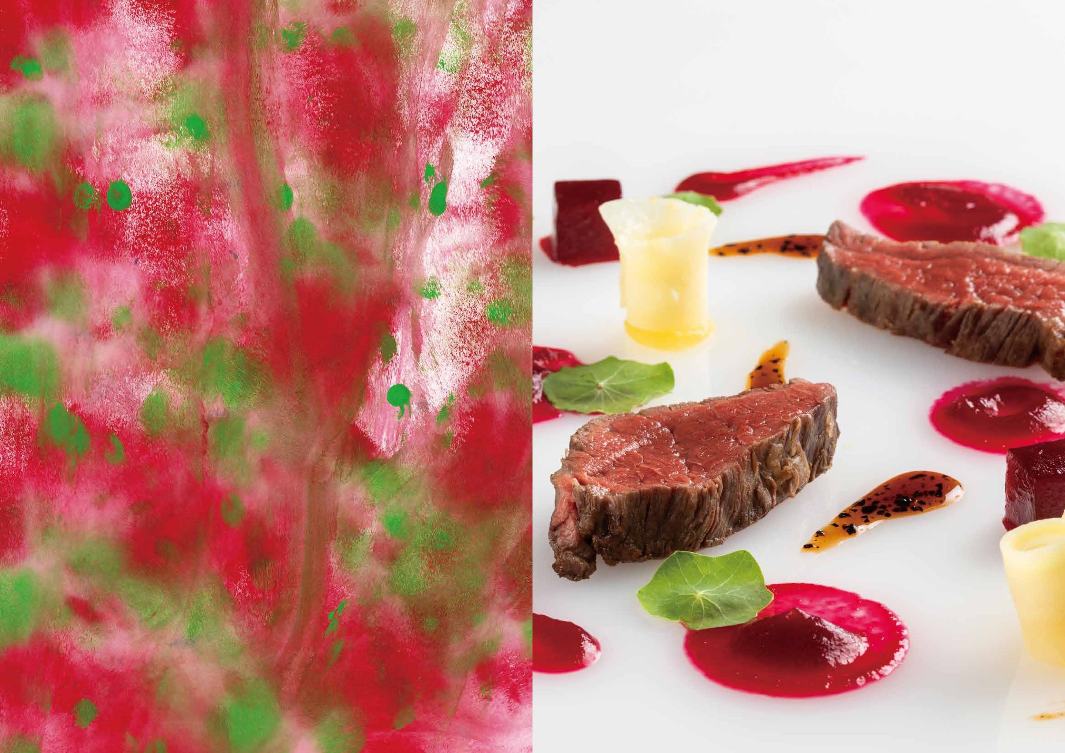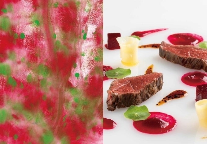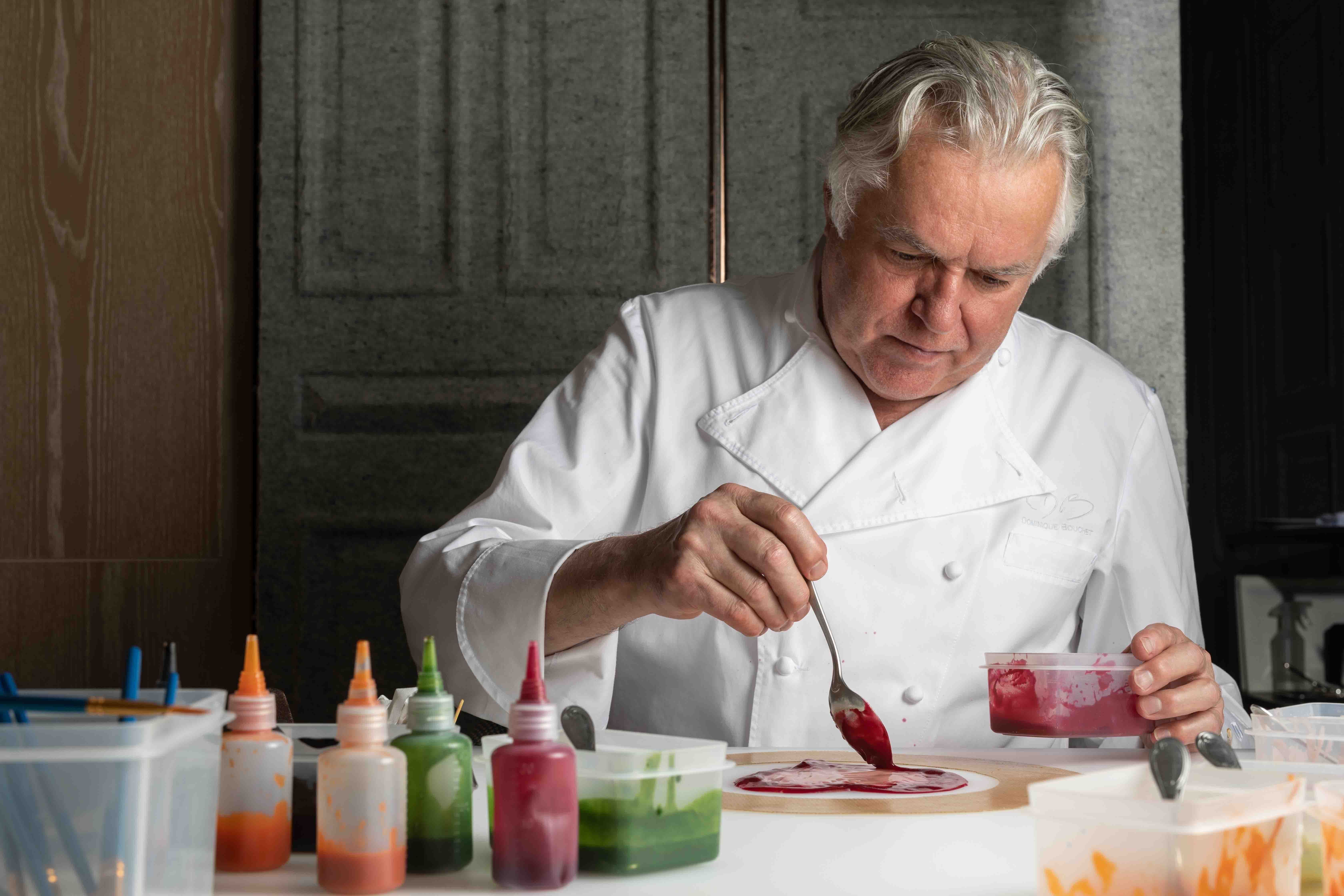 作品を見てドミニクシェフは自分でも驚くほどワクワクしました。それからは若きシェフたちの協力を得て、大好きな食材を次々とピュレに変え、美味しそうな「絵の具」が次々と並んでいきました。色と味のハーモニーを頭の中で何度も描いて熟考したものもあれば、即興で生まれるものもあり。ドミニクシェフのアール・ブリュット(生の芸術)は、皆さんに召し上がっていただくためのガストロノミー(美食)の料理へと発展していきました。