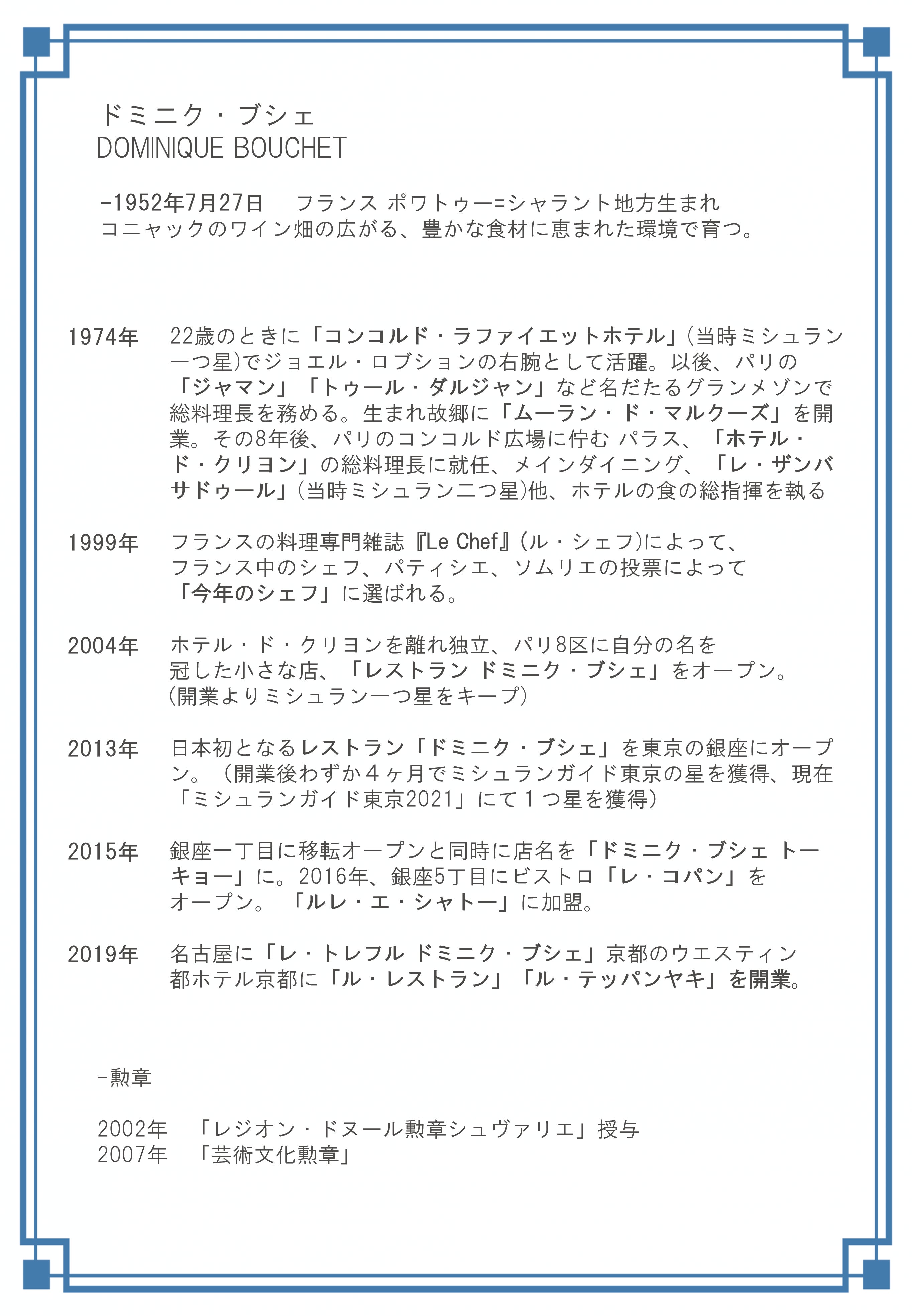 • 2、ドミニクシェフが「表現する楽しさ」を盛り込んだ新しい料理を体験していただきたく、銀座一丁目のドミニク・ブシェ トーキョー、銀座五丁目のビストロ、レ・コパン、京都のドミニク・ブシェで「特別コース」をご提供いたします。