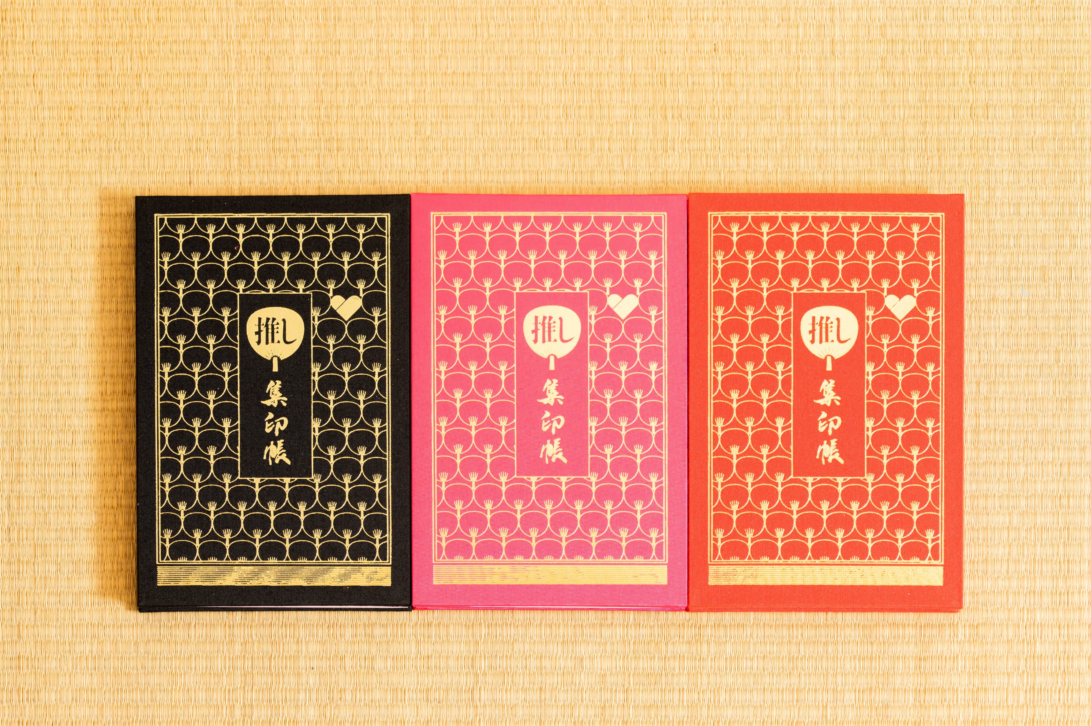推し心願成就のお寺「長久寺」のロゴである『推しうちわ』の柄を使用した、他には無いデザインの集印帳です。イメージカラーのピンクの他、情熱的な赤・シックな黒と3種をご用意いたしました。中の用紙は、3種とも薄いピンク色となっております。御朱印は、書かれておりません。(貼付けタイプを同封させていただきます)