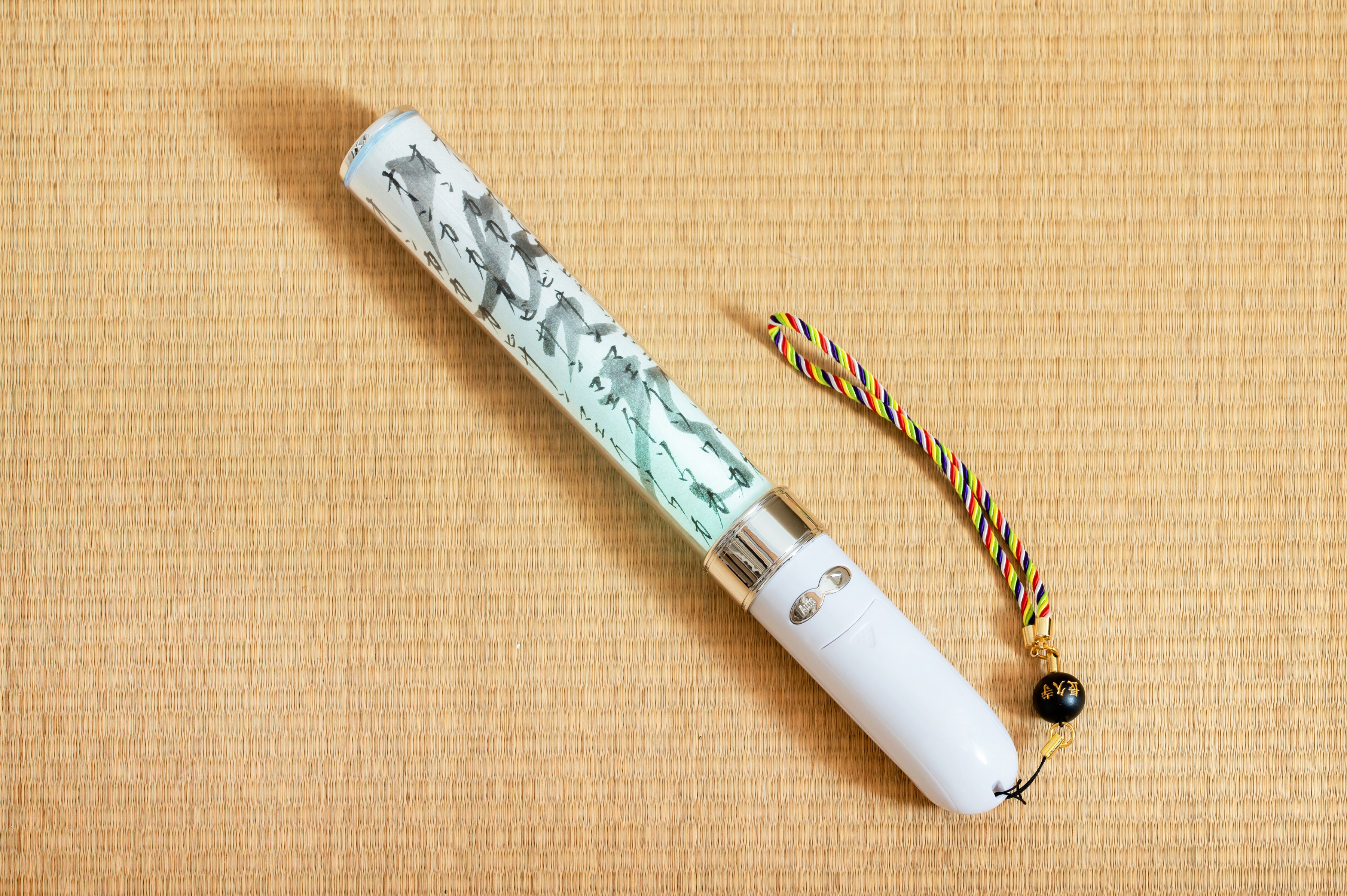 ライブ会場で大活躍の心願光明灯(しんがんこうみょうとう・ペンライト)です。光明部に書かれた「オンカカカビサンマエイソワカ」とは、長久寺本尊地蔵菩薩さまのご真言で一文字につき千の意味を持つ大変ありがたいお言葉です。このご真言を心で唱えながら、一心に推しに想いが届くよう振って応援して下さい。(18色に点灯します。この数字は、偶然にも観音さまのご縁日と同じです。)こちらも、ひとつひとつに想いを込めてご真言を書きあげ、ご祈願の後にお送りいたします。尚、ストラップ部分には黒檀の珠に寺名と推し活ロゴを配し、紐の部分は仏さまをお迎えする際に結界として使用する壇線をイメージしたものとなっております。