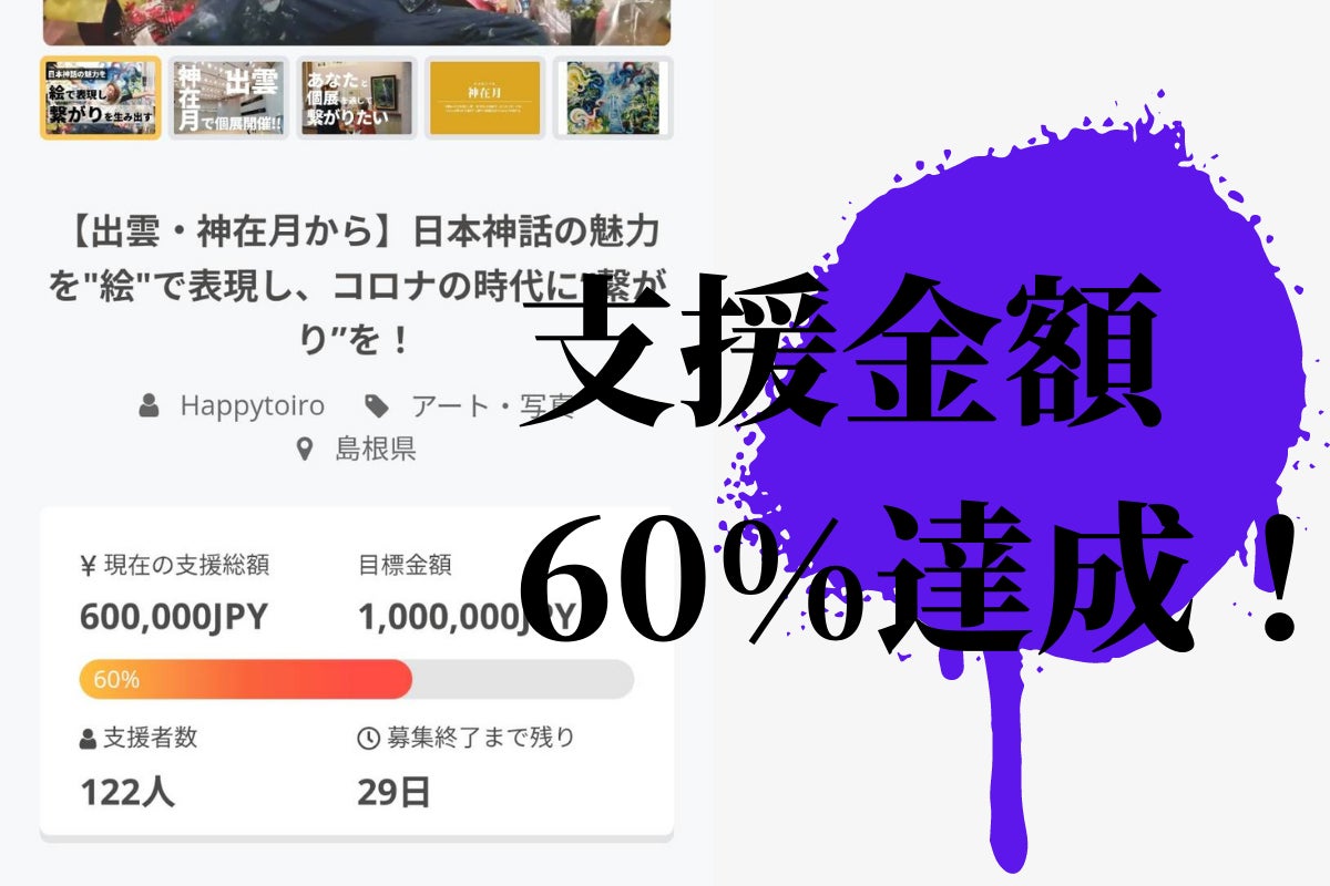 この調子で終盤までには目標金額100万円突破を目指し、皆さまとの“繋がり”を出雲個展大成功に導けるよう情熱を注いで参ります!