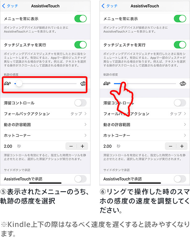 ※初期設定に書かれている⑥の「軌跡の感度」の調整が必要です。早くせず遅めで設定してください。