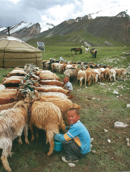 フェルト生地を手で伸ばしているところ(遊牧民は、草原で馬などに曳かせて伸ばします。) 遊牧民の山羊の乳搾り(モンゴルの遊牧民にとっては山羊の乳は貴重なタンパク源です。)