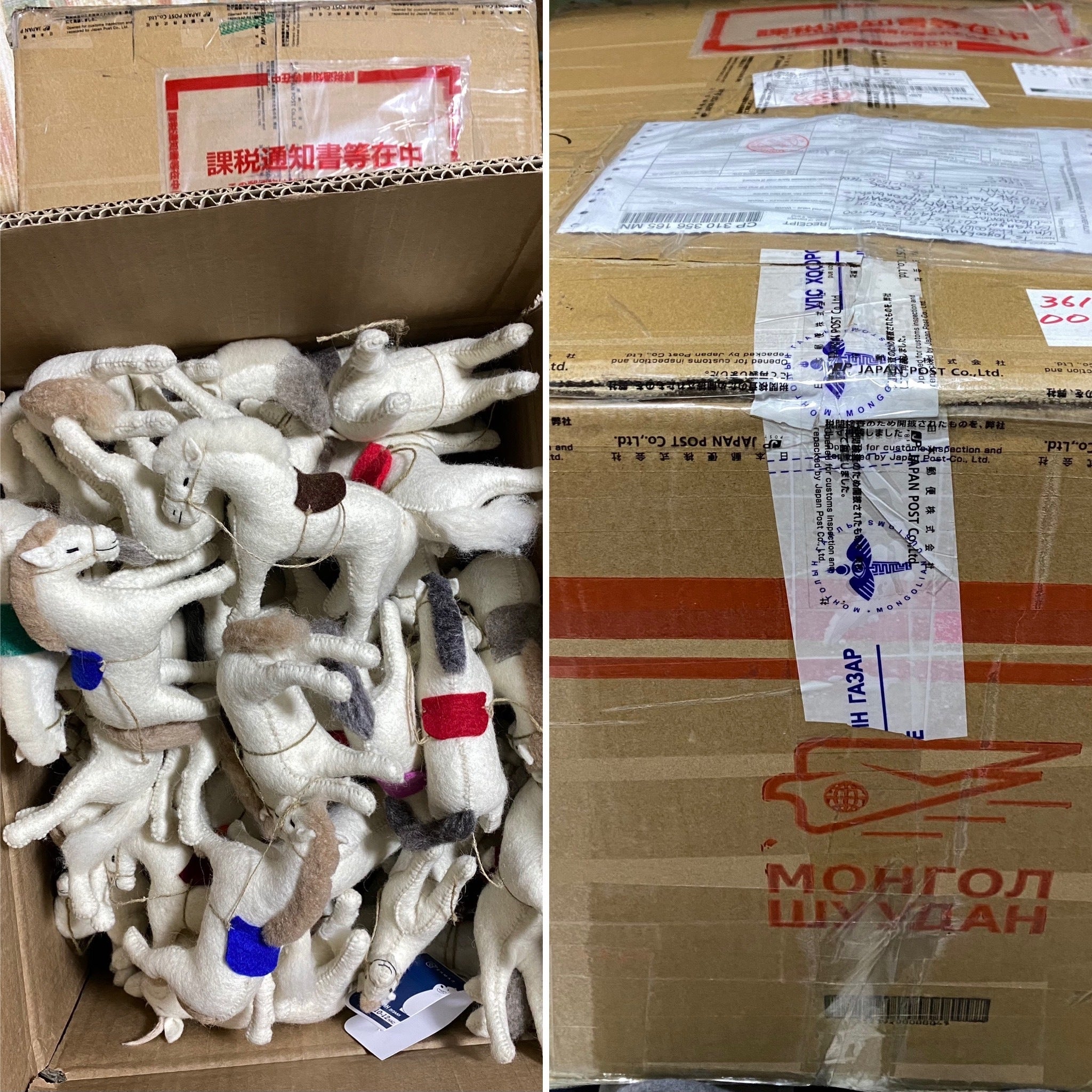 2021/11/07 20:43モンゴルから商品が無事に届きました。モンゴル郵便局の箱に入れられて遠いところからよくぞきました家畜達は^_^今日でクラウドファウンディングが終わりまして協力してくださった方々にリターン品が送られる準備に入ります。モンゴルの女性たちを代表して1人オユーナさんから、たくさんマスコット、フェルトスリッパを買ってくださってありがとうございましたと喜びの涙で電話がありました。感謝の気持ちがいっぱいで言葉だけでは喜びを伝えきれないようです。どうもありがとう、ありがとう、日本の皆様。心から感謝しております。のメッセージでした。 もっと見るリターン品のフェルト商品がほぼ完成しました!日本へ郵送する日をドキドキして待っています。