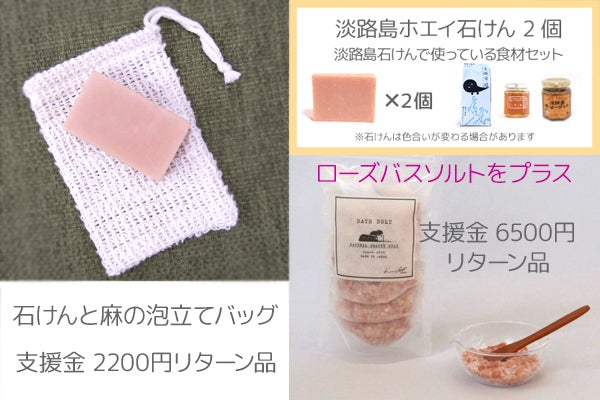 二つ目は、好評につき限定数に達しました「淡路島ホエイ石けんと淡路島石けんで使っている食材のセット」に「ローズバスソルト(ヒマラヤ岩塩)」を加えたリターンを追加致しました。