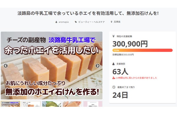 ネクストゴールは50万円です。ご支援いただいた資金は、「淡路島ホエイ石けん」の増産や「淡路島 無添加石けん」シリーズの開発費に使わせていただきます。