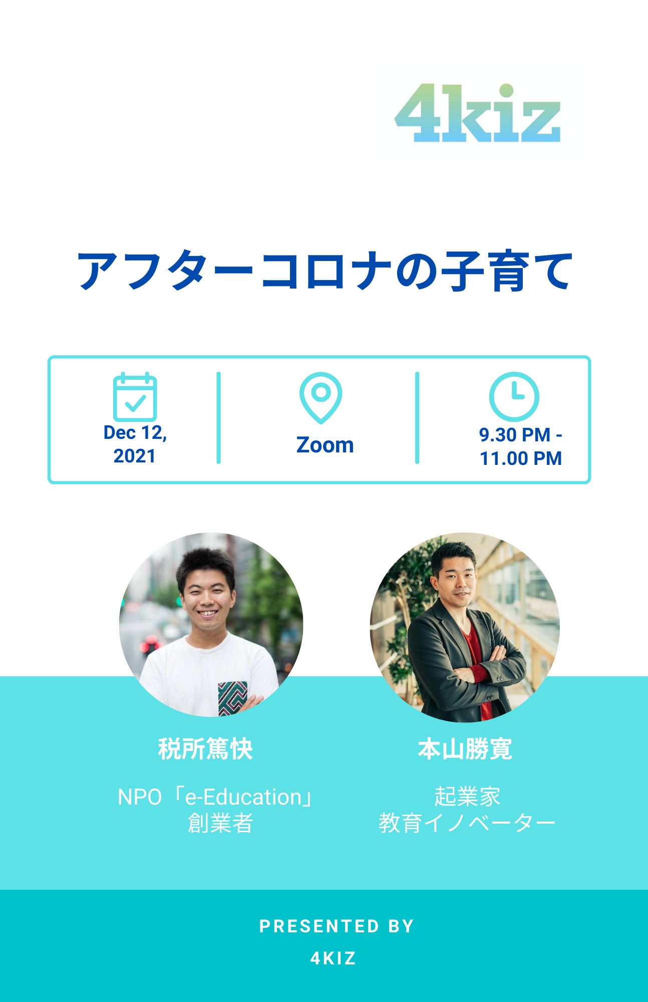 この度、株式会社4kizは、e-education創業者の税所篤快と教育起業家の本山勝寛による、「こどもSNS」クラウドファンディング記念特別対談「アフターコロナの子育て」を、下記の通りオンライン開催します。