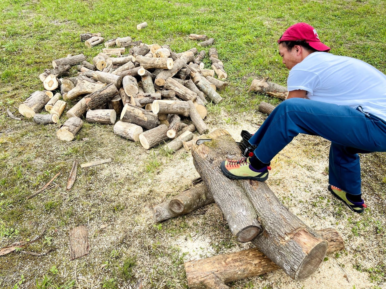 廃材を使って焚火スペースを作成中