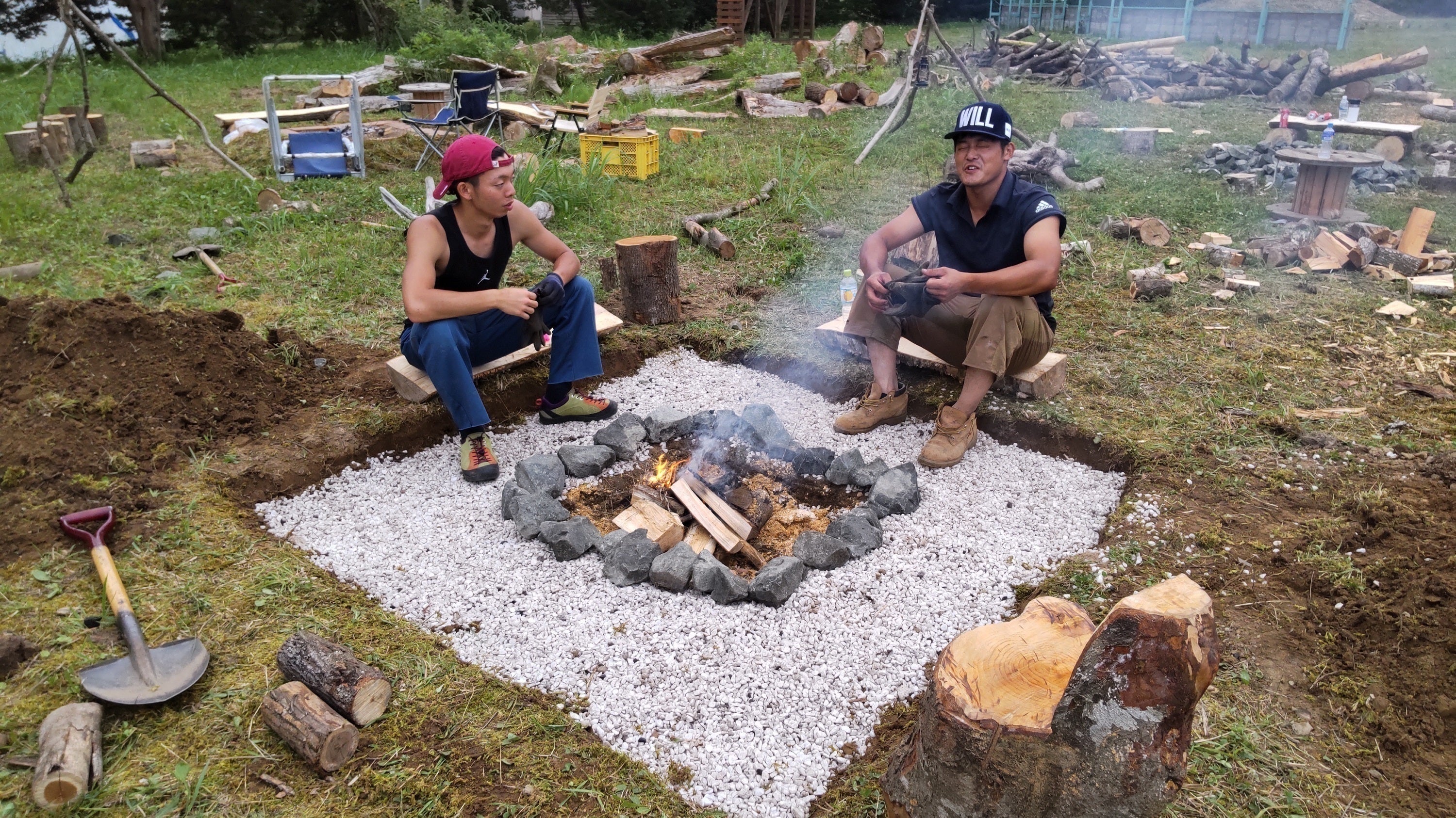 廃材を使って焚火スペースを作成中