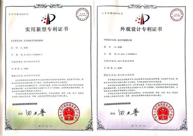 DRIVER ALARMは生産国の中国で、機能面で日本では実用新案に当たる「ドライバーの眠気を覚ます多機能アラーム」と、デザイン面で意匠登録に当たる「睡眠防止アラーム」として特許を取得。