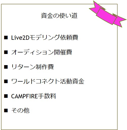 集まった支援金につきましては、オーディション開催に要する費用と2人分のLive2Dモデリング制作費 に充てさせていただこうと思います。併せて、リターンの製作費や配送料と、クラウドファンディングサイトの手数料にも充てさせていただきます。