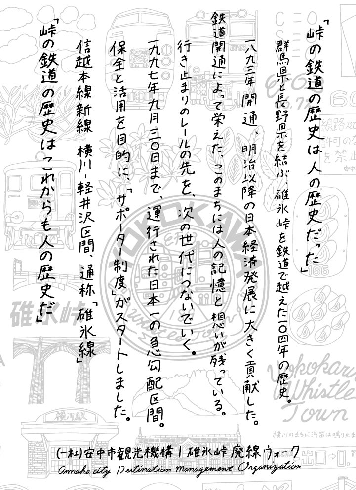【12月6日】13:40に「とうげのゆ駅」に集合15:20頃まで活動し、解散となります当日は霧積ブルワリーお休みのため・・・北高崎駅から徒歩15分ほどの『コタマブルワリー』にて!!懇親会を行えたらと思っておりますので、是非ご参加ください。時間はアバウトですが・・・ 17:00〜20:00の間で乾杯できたらと思います!会費制ではなく、キャッシュオンで!飲みたいビールを好きなペースで飲む感じで。列車でお越しの皆様は、峠の湯に入ってからも◎もう一つの選択肢はサポーター活動終了後、横川16:00発か、次の16:30発に乗って北高崎駅にて下車。徒歩でコタマブルワリーに向かい、その途中にある銭湯「浅草湯」もおすすめです。熱い湯が最高です。持ち物:ヘルメット・手袋など内容:除草作業、沿線整備など参加連絡はメールにて、ご連絡ください。宛先:ankankyo@lily.ocn.ne.jp件名:サポーター活動 参加連絡本文:例)X月X日の活動日に参加します。 上原将太 080-XXXX-XXXX参加日、氏名、連絡先を明記して、メールをお送りください。懇親会参加の方はメールにて、お知らせください!引き続き、サポーターの皆さまにお願いです!廃線ウォークを歩いて同行サポートしていただける方を募集しています!下り線コース集合場所:観光案内所 集合時間:10時日程:11月29日上り線コース集合場所:軽井沢駅北口 鉄道碑付近 集合時間:9時30分日程:11月30日こちら、サポートいただける方は、メールでご連絡いただけますと幸いです。1月は第二土曜日の10日に実施でお願いいたします!場所は峠の湯、周辺を予定しております。2月は第一土曜日の7日に実施します。同じく場所は峠の湯、周辺を予定しております。3月は第一土曜日の7日に実施します。こちらも同じく場所は峠の湯、周辺を予定しております。