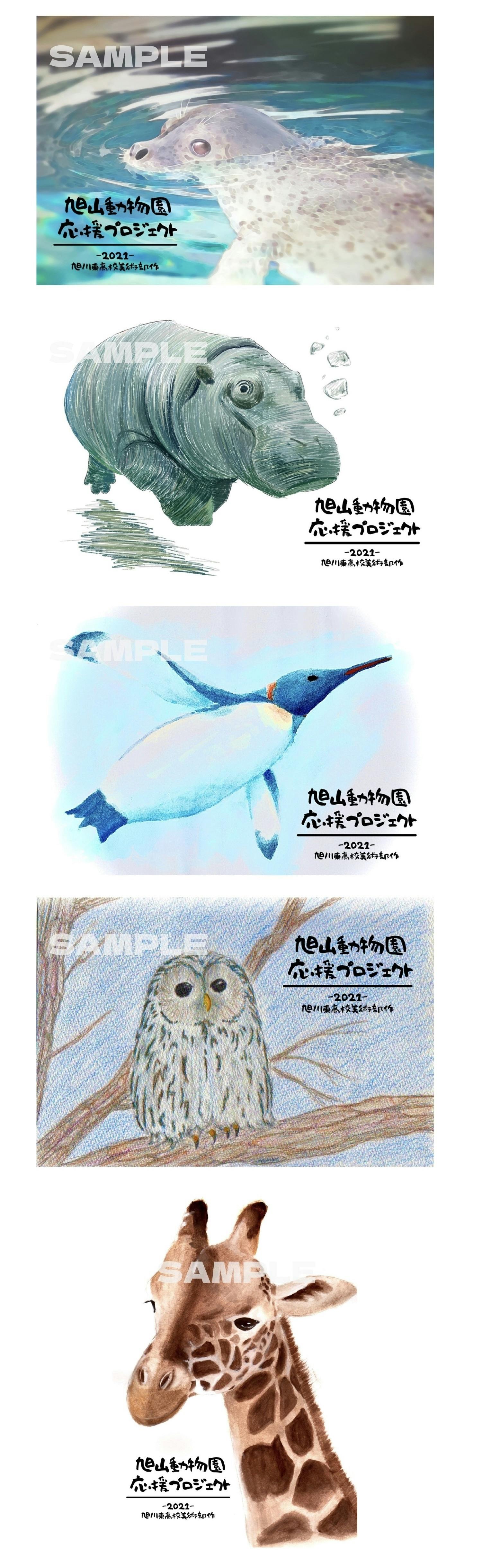 旭川東高校の美術部の生徒も本プロジェクトを応援してくださり、動物たちの絵を描いてくれました!それらは全5種のポストカードに仕上がりました。水彩画、色鉛筆画、デジタル画まで幅広く制作したので、それぞれの画法の良さを比較しながらお楽しみ頂けます!