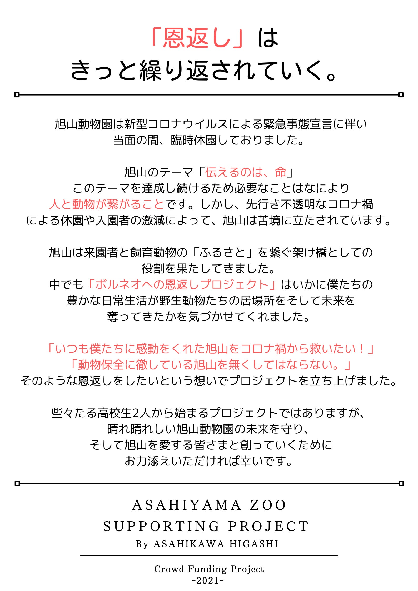 この度、旭山動物園の経営難をコロナ禍から救うと共に、旭山の動物保全活動を絶やさないことを目標にクラウドファンディングを実施させていただくことになりました。
