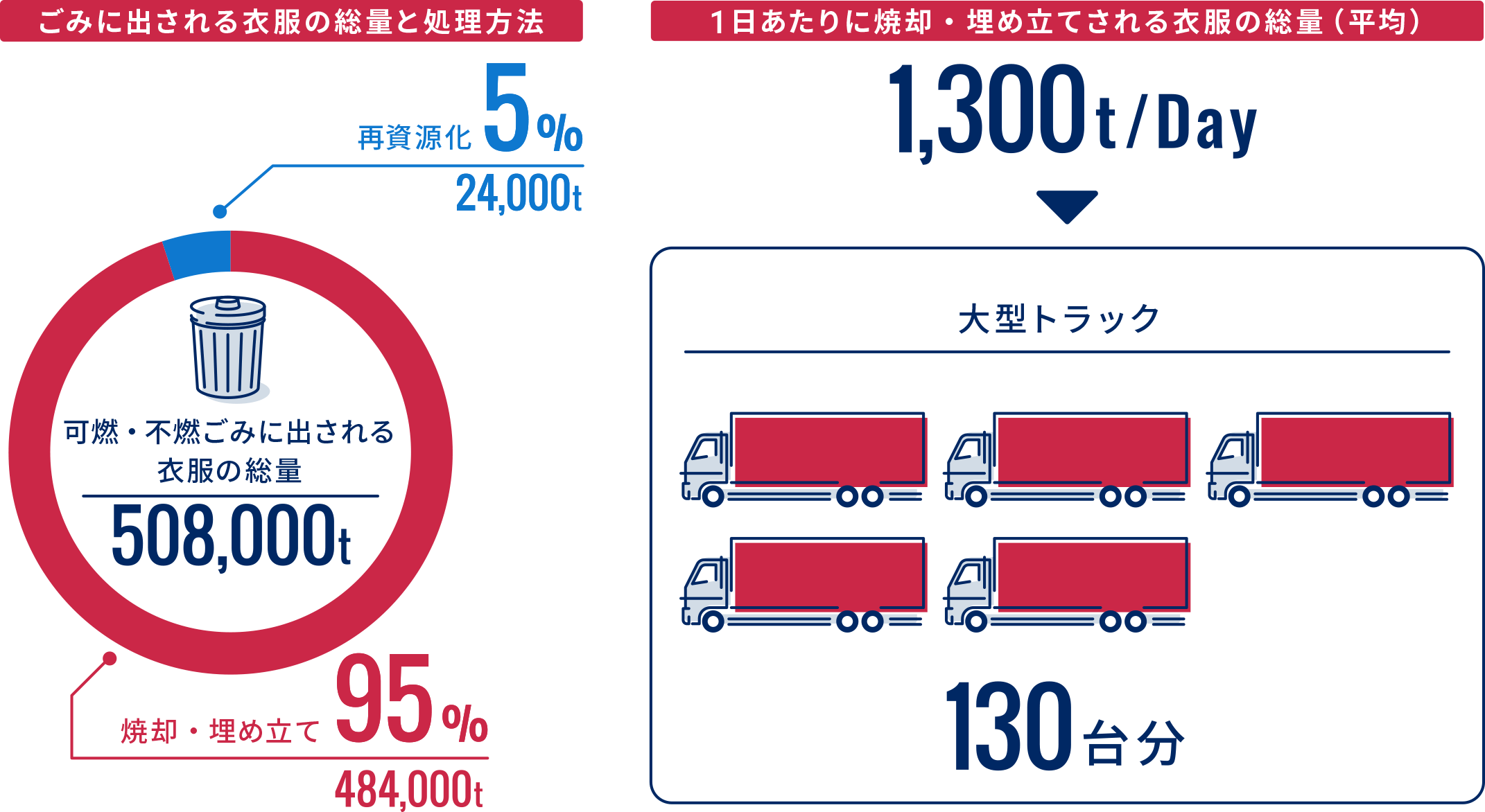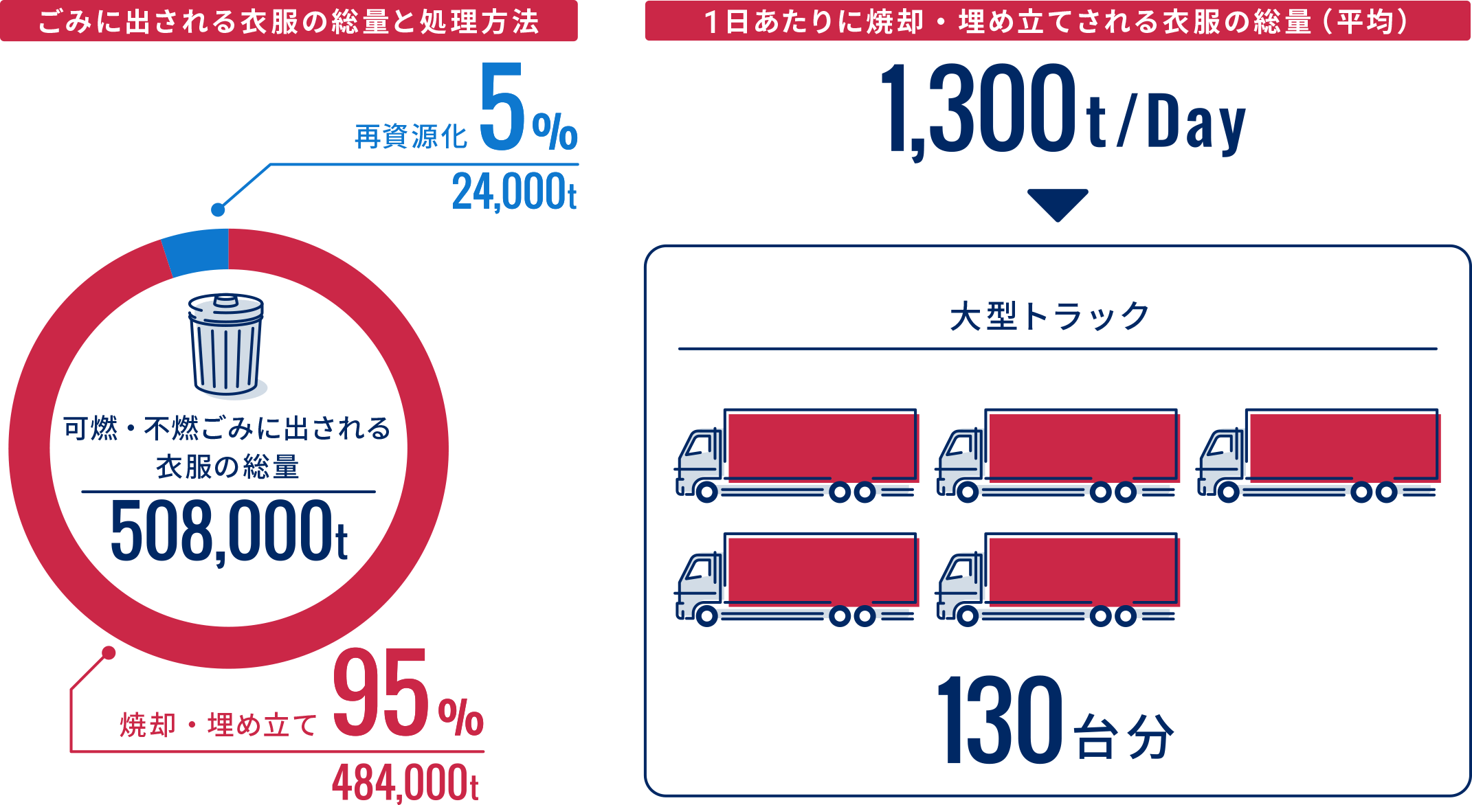 現在の日本では,年間48万トン以上もの廃棄衣料が,焼却や埋立ての方法で,処分されています。そのCO2排出量を考えると,地球にやさしい処分方法であるとは言えません。