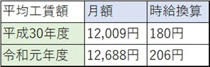 大阪市によると,平成30年度就労継続支援B型事業所の平均工賃額は月額12,009円,時給に換算すると180円でした。令和元年度の就労継続支援B型事業所の平均工賃額は月額12,688円,時給に換算すると206円になります。