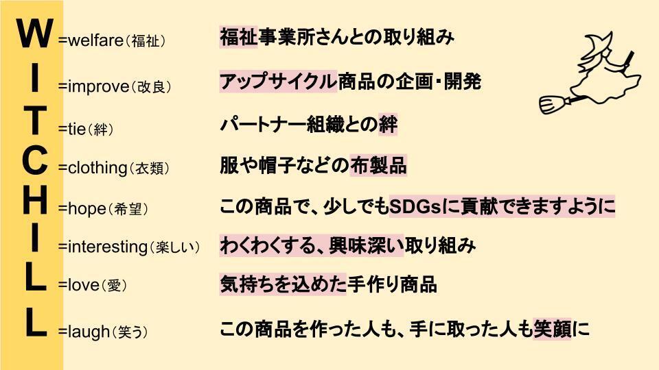 「衣の魔女」プロジェクトで企画した「WITCHILL(ウィッチル)」シリーズですが,この名前は,魔女を意味するWITCHと,ステキなという意味のCHILLを組み合わせてつくった商品ブランド名です。