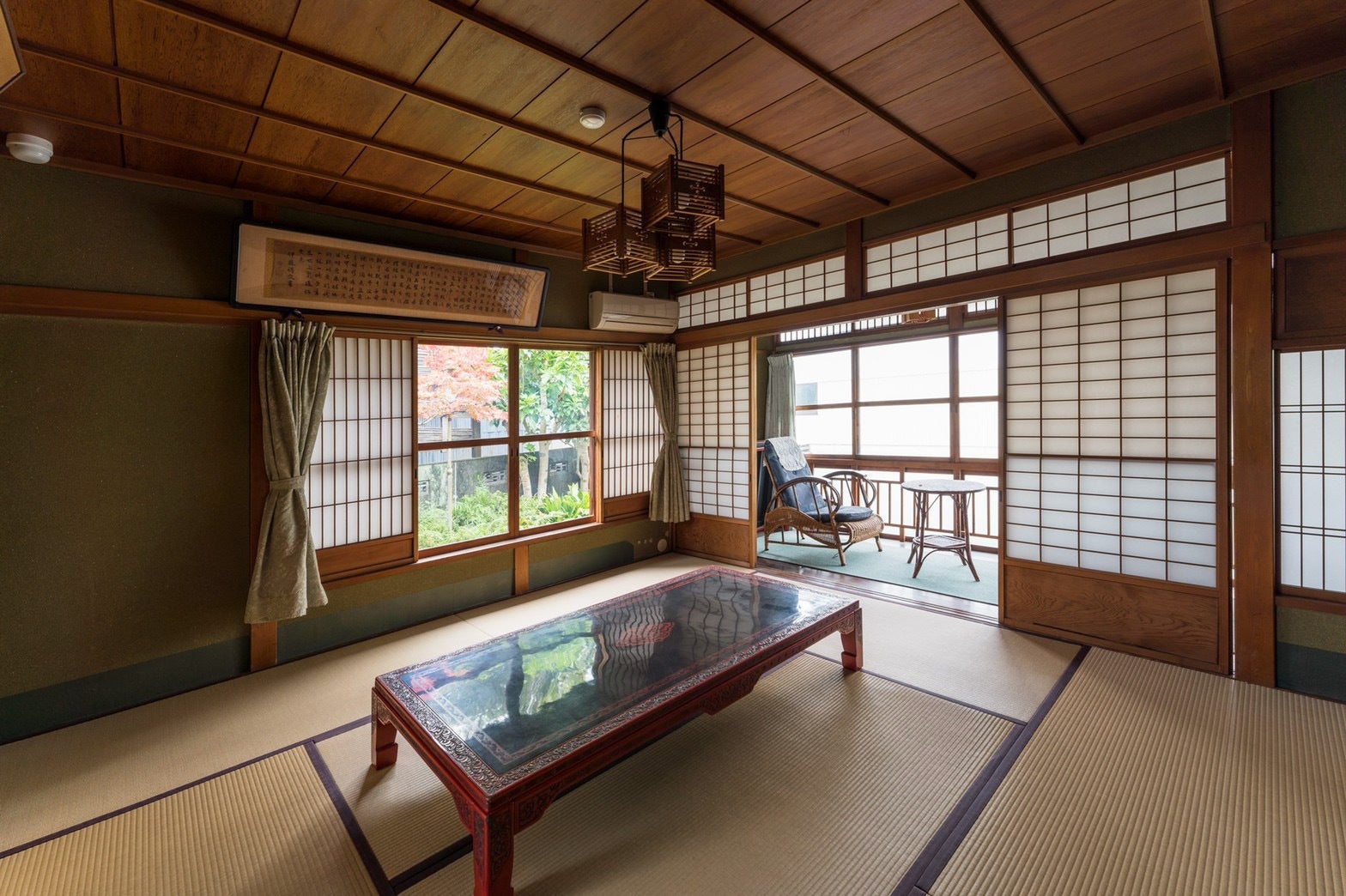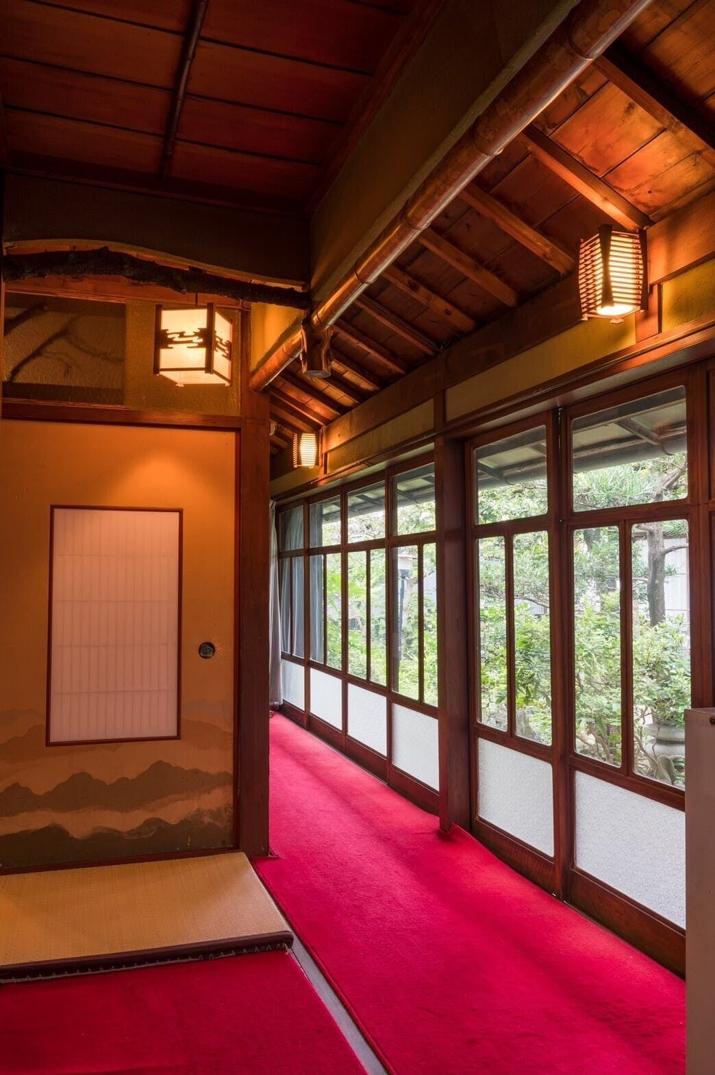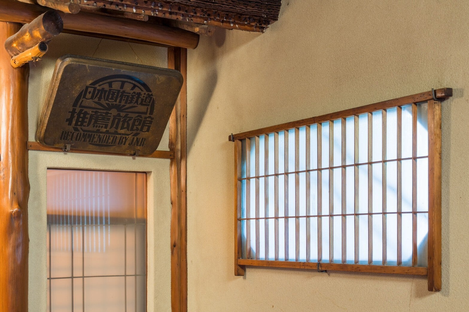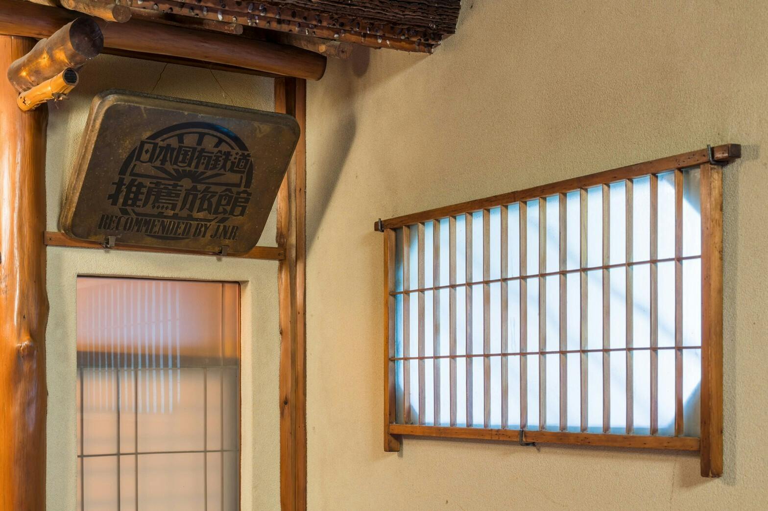 全ての個室には「待機室」がありこれは政治家などの接待の時に秘書が待機する部屋です。昭和の雰囲気を残す浴室や、一木のデザインプレート、長い縁側の下には防空壕が眠っています。旧国鉄推薦旅館プレート横の窓は、なんでも祖父が随分と悩んで意匠を凝らしたと伝え聞きました。